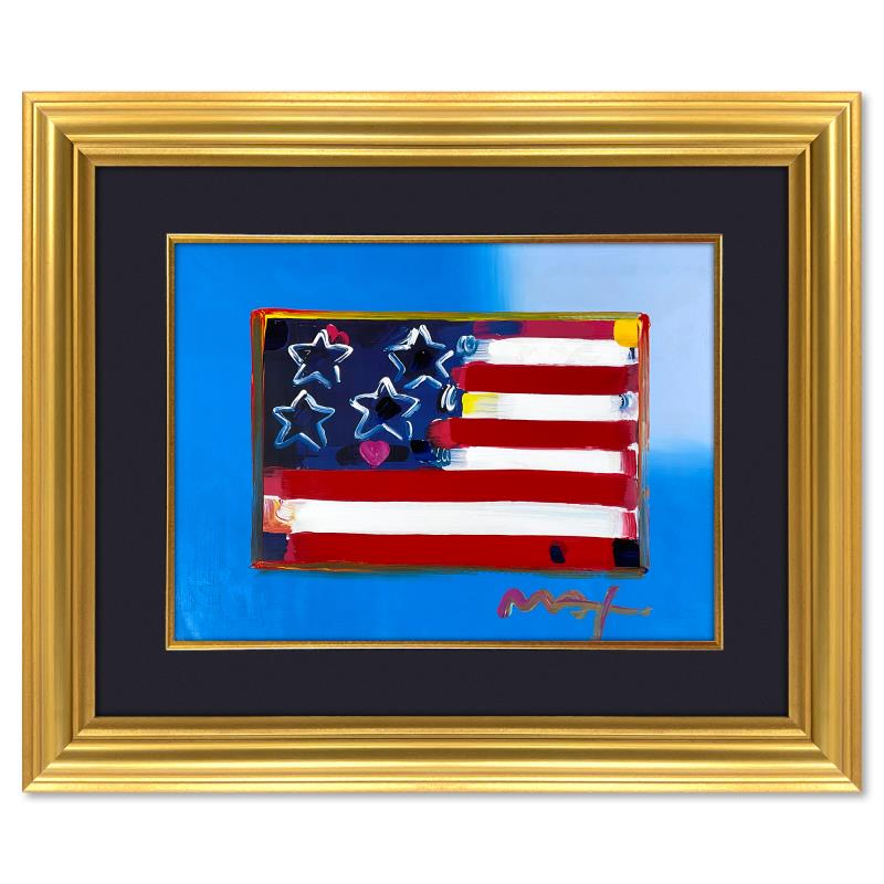 "Flag" is a one-of-a-kind acrylic mixed media on paper, hand signed by Peter Max. The piece comes custom framed with a backside cutout to display Peter Max Studio registration number 207553 certifying authenticity. Measures approx. 29" x 35" (frame), 18" x 24" (image). This item requires special handling and may have a longer than usual turnaround.