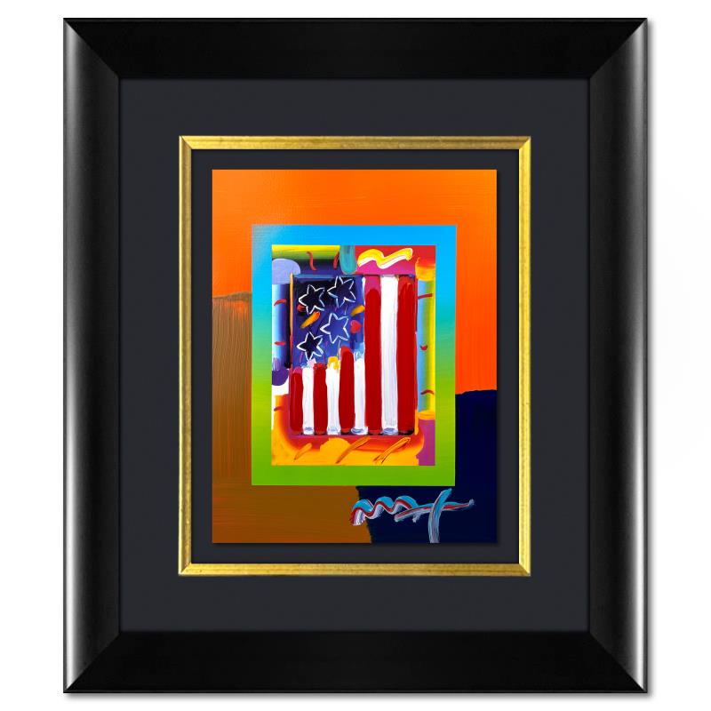 "Flag with Heart" is a hand signed one-of-a-kind acrylic mixed media on paper by Peter Max. The piece comes custom framed with a backside cutout to display Peter Max Studio registration number 253001 certifying authenticity. Measures approximately 30" x 26" (frame), 17" x 13" (image). This item requires special handling and may have a longer than usual turnaround.