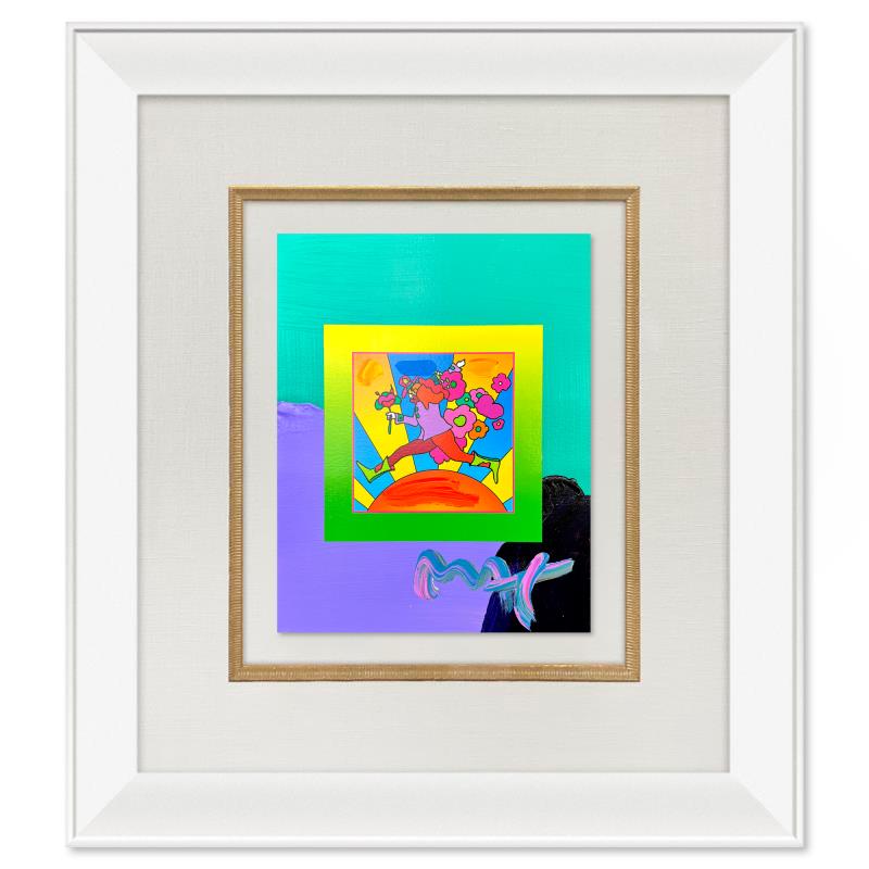 "Flower Jumper" is a hand signed one-of-a-kind acrylic mixed media on paper by Peter Max. The piece comes custom framed with a backside cutout to display Peter Max Studio registration number 278626 certifying authenticity. Measures approximately 26" x 23" (frame), 13" x 10" (image). This item requires special handling and may have a longer than usual turnaround.