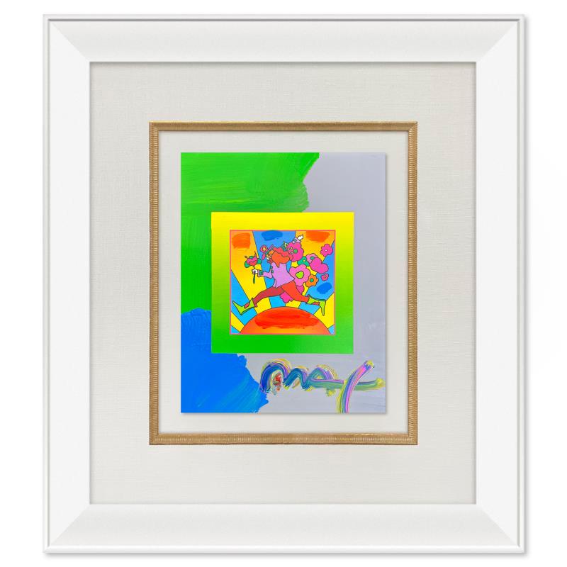 "Flower Jumper" is a hand signed one-of-a-kind acrylic mixed media on paper by Peter Max. The piece comes custom framed with a backside cutout to display Peter Max Studio registration number 279651 certifying authenticity. Measures approximately 26" x 23" (frame), 13" x 10" (image). This item requires special handling and may have a longer than usual turnaround.