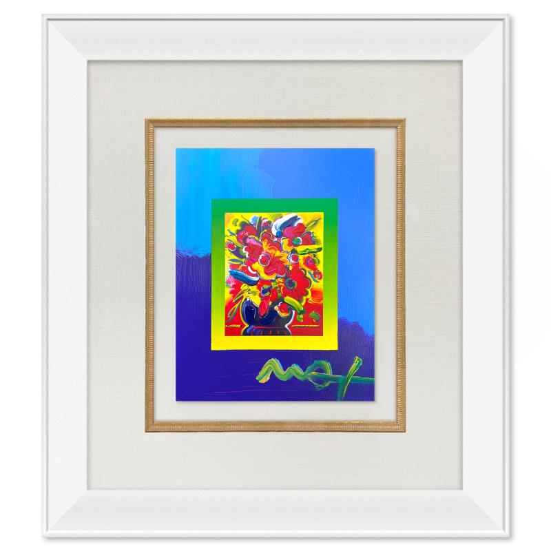 "Flowers" is a hand signed one-of-a-kind acrylic mixed media on paper by Peter Max. The piece comes custom framed with a backside cutout to display Peter Max Studio registration number 270633 certifying authenticity. Measures approximately 26" x 23" (frame), 13" x 10" (image). This item requires special handling and may have a longer than usual turnaround.