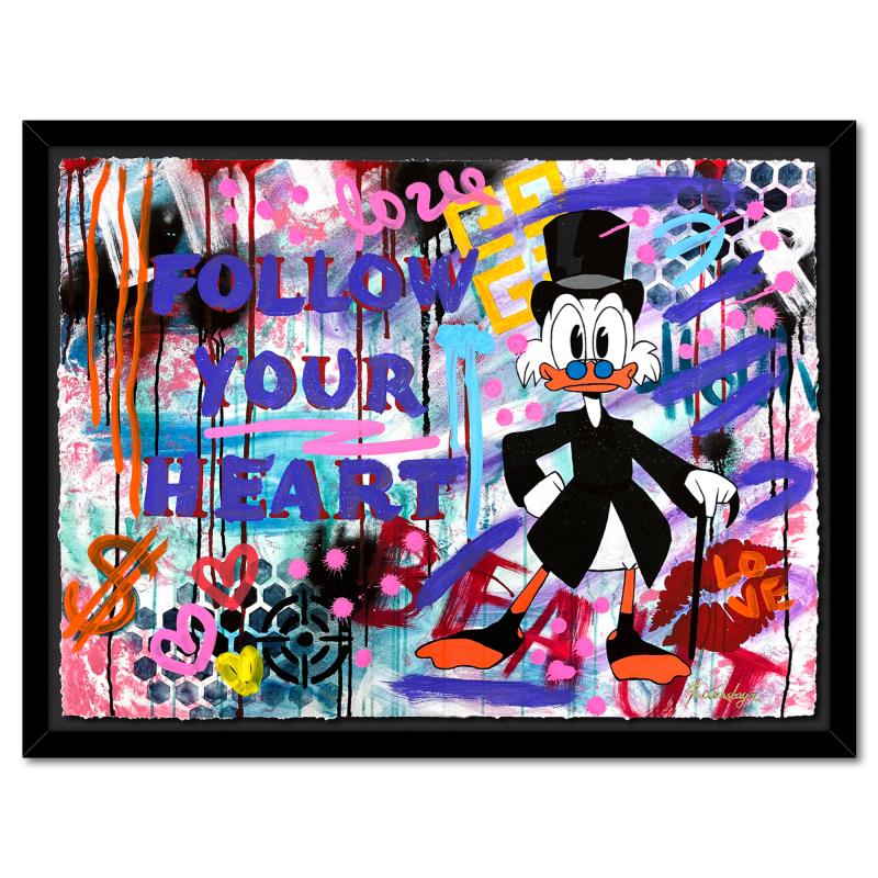 "Follow Your Heart" is a one-of-a-kind mixed media on deckle edge paper by Nastya Rovenskaya; hand signed by the artist. This piece comes custom framed and includes letter of authenticity. Measures approximately 36" x 46" (framed), 30" x 40" (image).