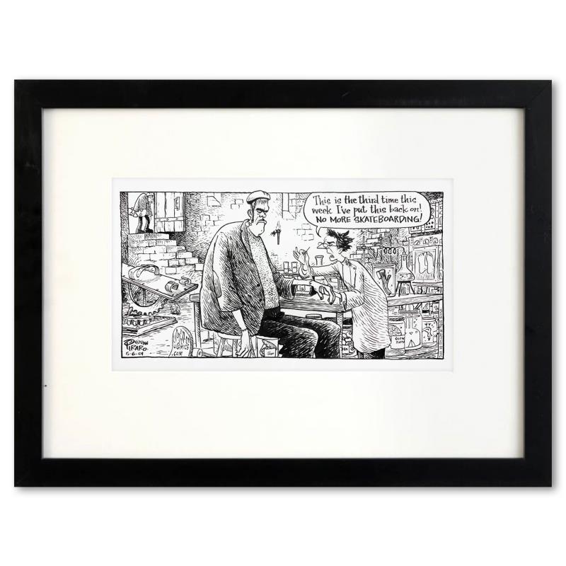 Enter a surreal and satirical world of twisted imagination and award winning creativity. "Frankenstein Skateboarding" is an original pen & ink drawing on paper by Dan Piraro, creator of the critically acclaimed and award winning comic strip, Bizarro. This piece is hand signed, comes custom framed and includes a letter of authenticity. Measures approximately 14" x 21" (frame), 7" x 13" (image). This item requires special handling and may have a longer than usual turnaround.