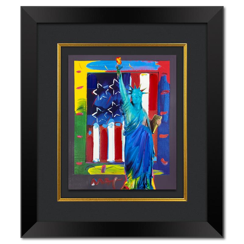 "Full Liberty with Flag" is a one-of-a-kind acrylic mixed media on paper, hand signed by Peter Max. The piece comes custom framed with a backside cutout to display Peter Max Studio registration number 209286 certifying authenticity. Measures approx. 28" x 24" (frame), 19" x 15" (image). This item requires special handling and may have a longer than usual turnaround.