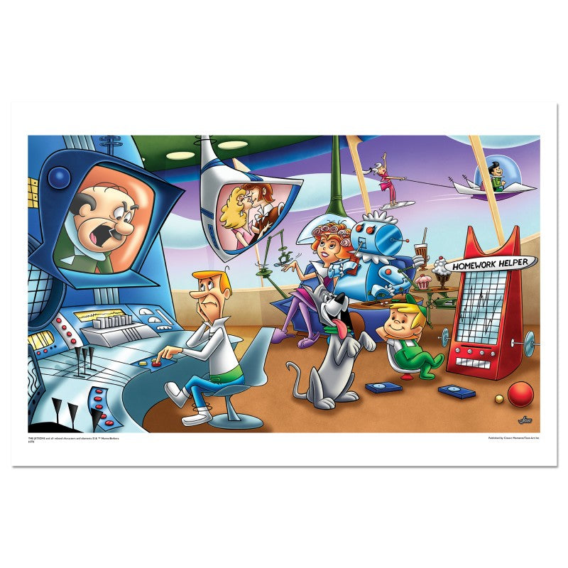 "Gadgets" is a licensed limited edition lithograph on paper featuring classic Hanna-Barbera characters from The Jetsons. The piece comes numbered, with hologram seal, and a Certificate of Authenticity! Measures approximately 16" x 24" (with border), 13" x 22.5" (image).