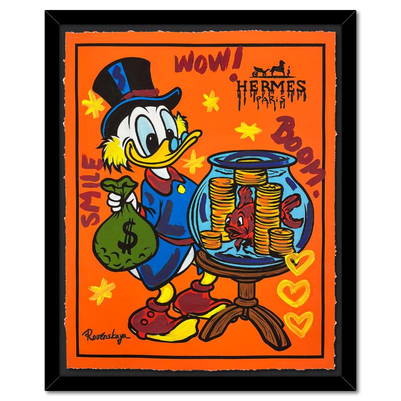 "Goldfish" is a one-of-a-kind mixed media on deckle edge paper by Nastya Rovenskaya; hand signed by the artist. This piece comes custom framed and includes letter of authenticity. Measures approximately 36" x 30.5" (framed), 30" x 24.5" (image).