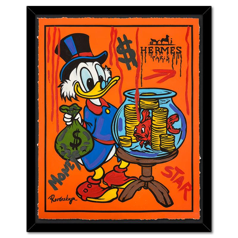 "Goldfish" is a one-of-a-kind mixed media on deckle edge paper by Nastya Rovenskaya; hand signed by the artist. This piece comes custom framed and includes letter of authenticity. Measures approximately 36" x 30.5" (framed), 30" x 24.5" (image). This item requires special handling and may have a longer than usual turnaround.