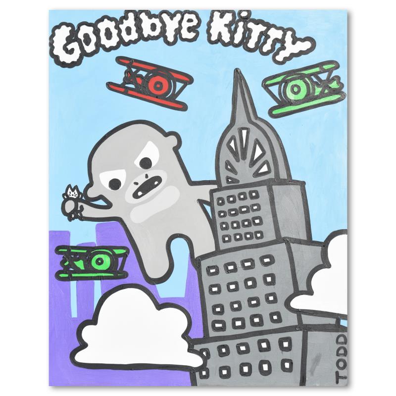 "Goodbye Kitty" is an original acrylic painting on gallery wrapped canvas by Todd Goldman, hand signed by the artist. Includes Letter of Authenticity. Measures approx. 48" x 60" (image). Due to the way this piece was stored there may be minor wear or signs of age (such as wear on the corners) but the piece is in overall good condition.
