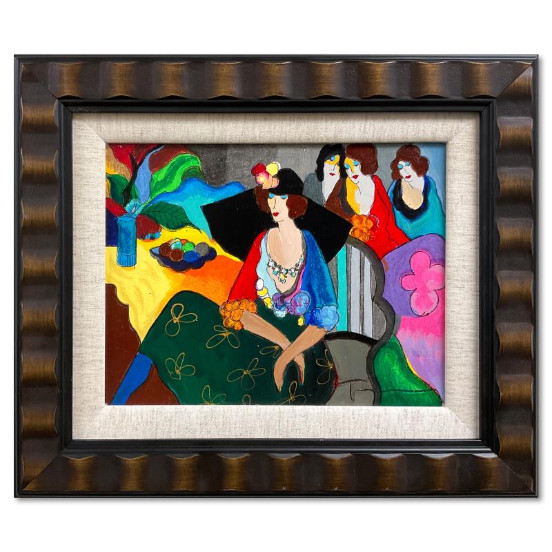 "Gossip" is a one-of-a-kind mixed media over paint on wood by Itzchak Tarkay (1935-2012), hand signed by the artist. This piece comes custom framed. Includes Letter of Authenticity. Measures approx. 14.5" x 17" (frame), 9" x 11" (image).