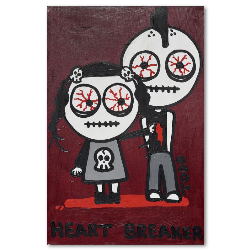 "Heart Breaker" is an original acrylic painting on gallery wrapped canvas by Todd Goldman, hand signed by the artist. Includes Letter of Authenticity. Measures approx. 24" x 36" (image). Due to the way this piece was stored there may be minor wear or signs of age (such as wear on the corners) but the piece is in overall good condition.