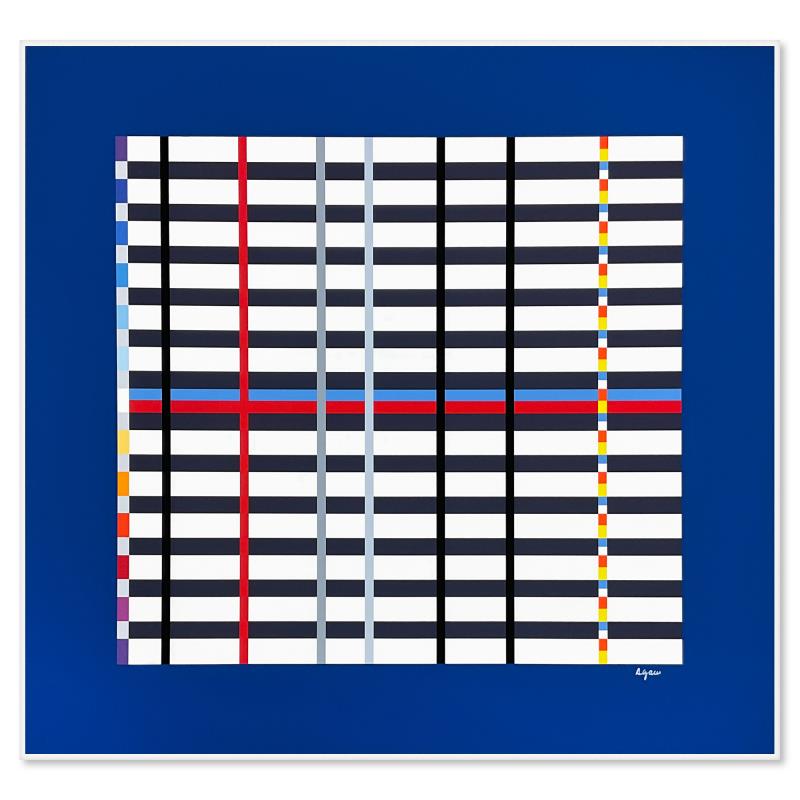 "Hommage du Mondrian (Dark Blue)" is a limited edition serigraph on paper by Yaacov Agam, hand signed by the artist. Includes Letter of Authenticity. Measures approx. 26.5" x 28" (image).