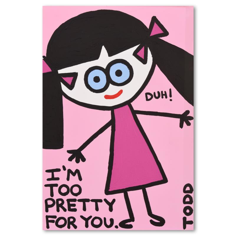 "I'm Pretty" is an original acrylic painting on gallery wrapped canvas by Todd Goldman, hand signed by the artist. Includes Letter of Authenticity. Measures approx. 24" x 36" (image). Due to the way this piece was stored there may be minor wear or signs of age (such as wear on the corners) but the piece is in overall good condition.