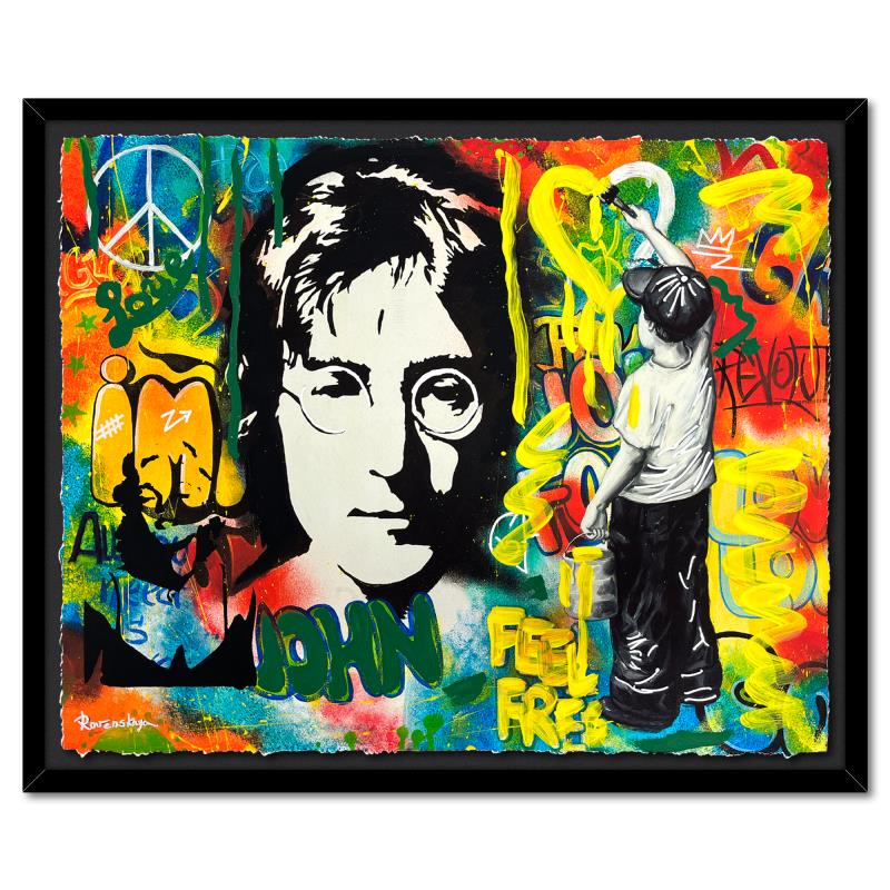 "Imagine All The People" is a one-of-a-kind mixed media on deckle edge paper by Nastya Rovenskaya; hand signed by the artist. This piece comes custom framed and includes letter of authenticity. Measures approximately 30" x 36" (framed), 24" x 30" (image).