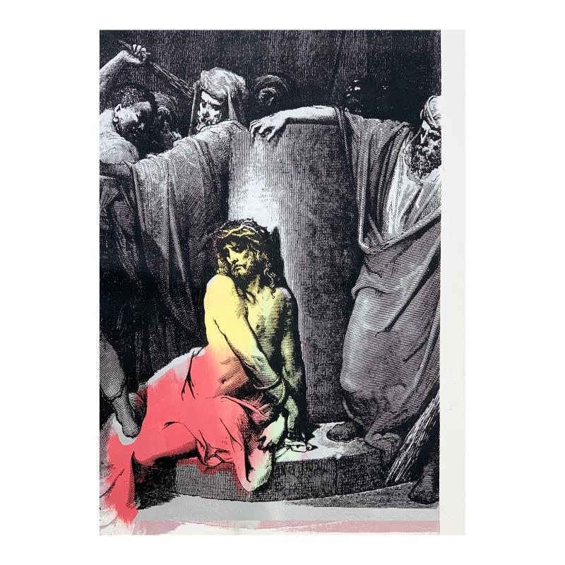 "Jesus in Thorns state 1" is limited edition hand pulled silkscreen unique mixed media on canvas by Andy Warhol protege Steve Kaufman (1960-2010). This piece is numbered and hand signed inverso and includes a letter of authenticity. As is common with Kaufman's works, this piece may have perceived minor flaws, but is in overall good condition. Measures approximately 26" x 18" before cropping.