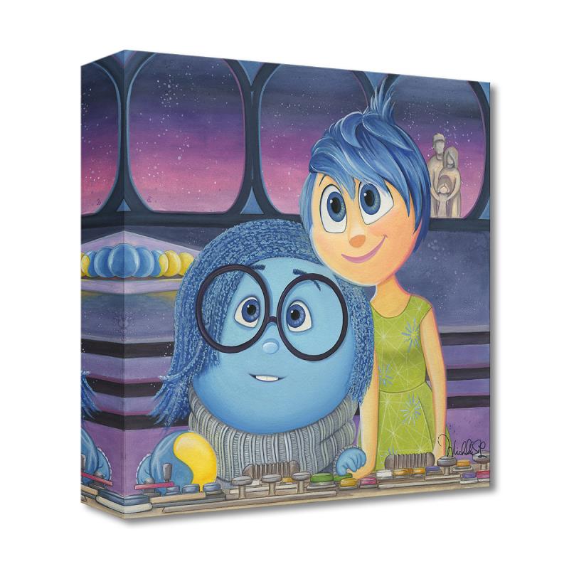 "Joy and Sadness" is a limited edition giclee on canvas by Michelle St. Laurent. Part of the Treasures collection from Disney Fine Art, this limited edition featuring Inside Out imagery comes gallery wrapped and ready to hang and comes with a certificate of authenticity. The edition is limited to 1500 pieces. Item measures approximately 14" x 14".