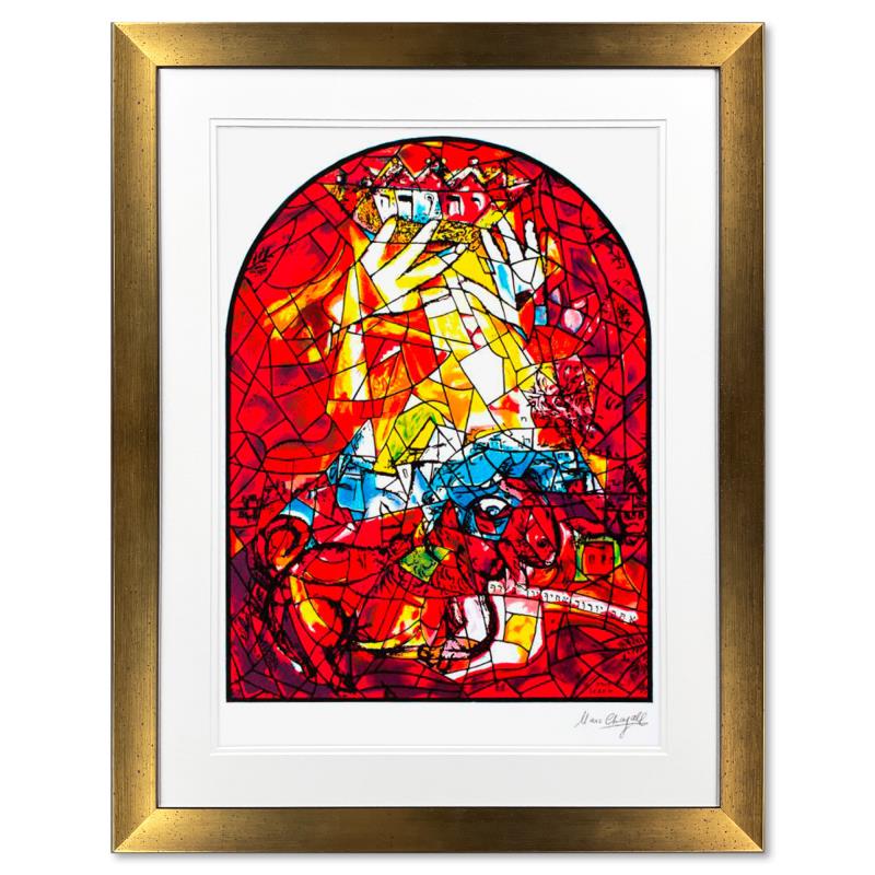 "Judah" is a framed limited edition serigraph on paper by Marc Chagall (1887-1985). Authorized by the Chagall Estate and ADAGP Paris , the piece is plate signed and comes with a certificate of authenticity. Measures approximately 38" x 36" (frame), 27.5" x 21" (image).