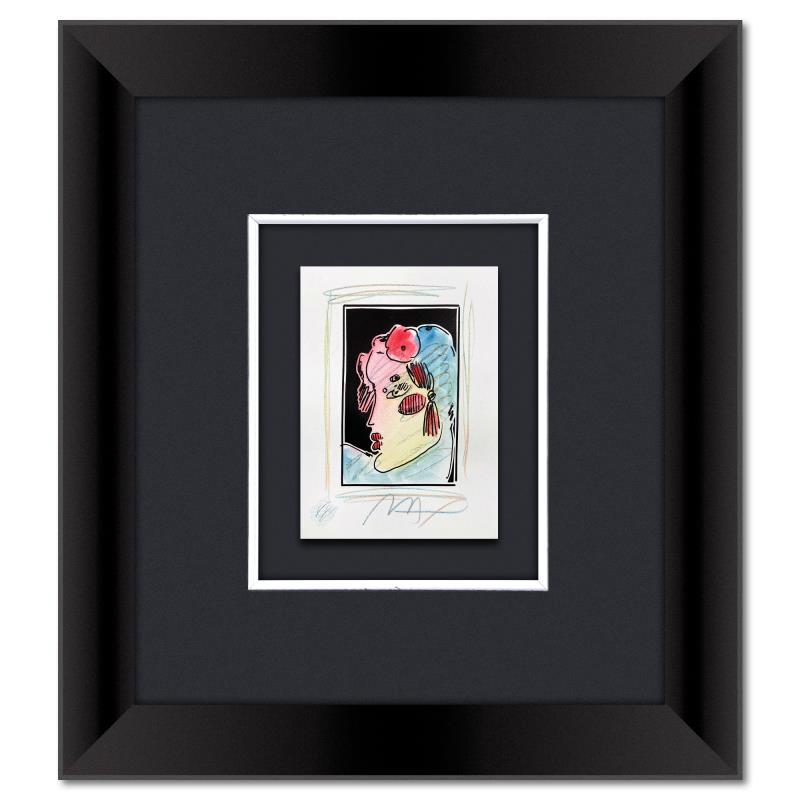 "Lady with Profile and Flowers II" is a one-of-a-kind mixed media on paper, hand signed by Peter Max. The piece comes custom framed with a backside cutout to display Peter Max Studio registration number 371185 certifying authenticity. Measures approx. 22.5" x 21.5" (frame), 8" x 6" (image). This item requires special handling and may have a longer than usual turnaround.