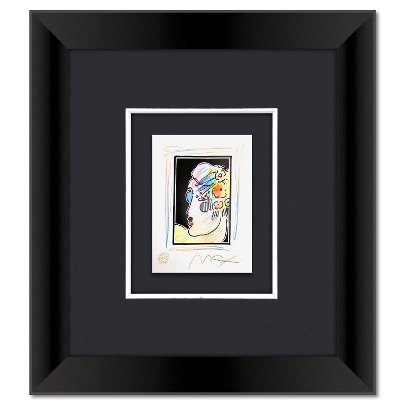 "Lady with Profile and Flowers III" is a one-of-a-kind mixed media on paper, hand signed by Peter Max. The piece comes custom framed with a backside cutout to display Peter Max Studio registration number 370116 certifying authenticity. Measures approx. 22.5" x 21.5" (frame), 8" x 6" (image). This item requires special handling and may have a longer than usual turnaround.