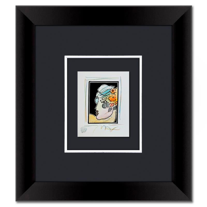 "Lady with Profile and Flowers III" is a one-of-a-kind mixed media on paper, hand signed by Peter Max. The piece comes custom framed with a backside cutout to display Peter Max Studio registration number 370131 certifying authenticity. Measures approximately 23" x 21" (frame), 9" x 7" (image). This item requires special handling and may have a longer than usual turnaround.