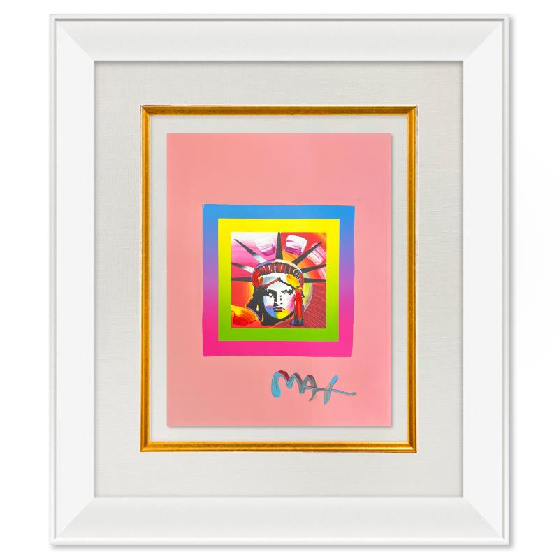 "Liberty" is a hand signed one-of-a-kind acrylic mixed media on paper by Peter Max. The piece comes custom framed with a backside cutout to display Peter Max Studio registration number 158351 certifying authenticity. Measures approximately 30" x 26" (frame), 17" x 13" (image). This item requires special handling and may have a longer than usual turnaround.