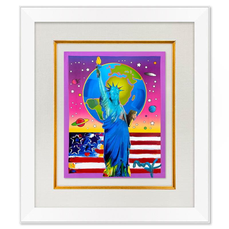 "Liberty, Earth and Flag" is a one-of-a-kind mixed media on paper, hand signed by Peter Max. The piece comes custom framed with a backside cutout to display Peter Max Studio registration number 208269 certifying authenticity. Measures approximately 28" x 24" (frame), 19" x 15" (image). This item requires special handling and may have a longer than usual turnaround.