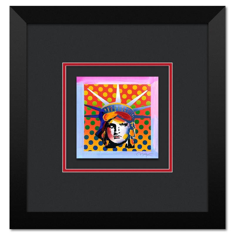 "Liberty Head XI" is a limited edition lithograph on paper by Peter Max, numbered and hand signed by the artist. This piece comes framed. Includes Certificate of Authenticity from Peter Max Studios. Measures approx. 17" x 17" (frame), 7" x 7" (image).