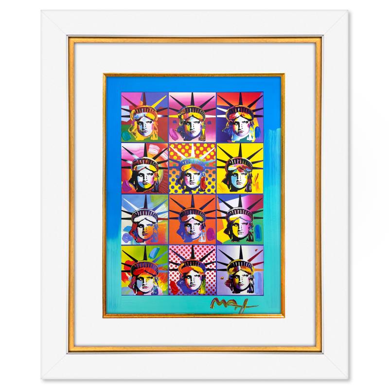 "Liberty & Justice" is a one-of-a-kind mixed media on paper, hand signed by Peter Max. The piece comes custom framed with a backside cutout to display Peter Max Studio registration number 200238 certifying authenticity. Measures approximately 35" x 29" (frame), 24" x 18" (image). This item requires special handling and may have a longer than usual turnaround.