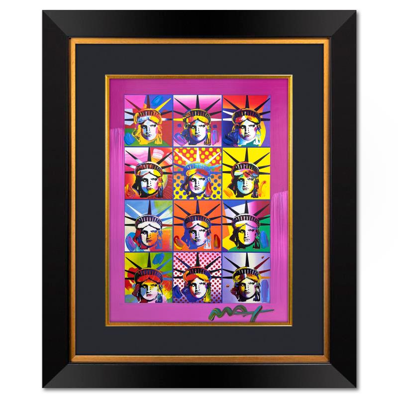 "Liberty & Justice" is a one-of-a-kind mixed media on paper, hand signed by Peter Max. The piece comes custom framed with a backside cutout to display Peter Max Studio registration number 200233 certifying authenticity. Measures approximately 35" x 29" (frame), 24" x 18" (image). This item requires special handling and may have a longer than usual turnaround.