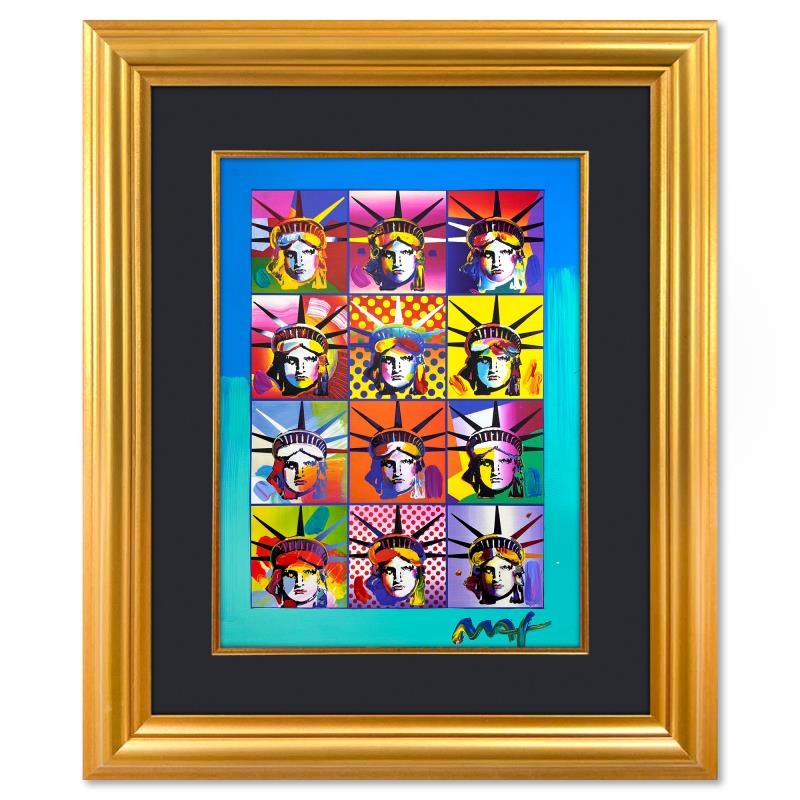 "Liberty & Justice" is a one-of-a-kind mixed media on paper, hand signed by Peter Max. The piece comes custom framed with a backside cutout to display Peter Max Studio registration number 200239 certifying authenticity. Measures approximately 35" x 29" (frame), 24" x 18" (image). This item requires special handling and may have a longer than usual turnaround.
