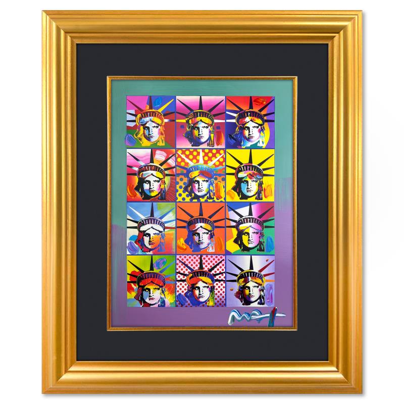 "Liberty & Justice" is a one-of-a-kind mixed media on paper, hand signed by Peter Max. The piece comes custom framed with a backside cutout to display Peter Max Studio registration number 200230 certifying authenticity. Measures approximately 35" x 29" (frame), 24" x 18" (image). This item requires special handling and may have a longer than usual turnaround.