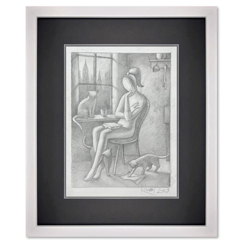 "Lit Cats" is an original drawing on paper by Mark Kostabi, hand signed by the artist. This piece comes custom framed and includes a certificate of authenticity. Measures approximately 19" x 14.5" (frame), 13" x 8.5" (image). This item requires special handling and may have a longer than usual turnaround.