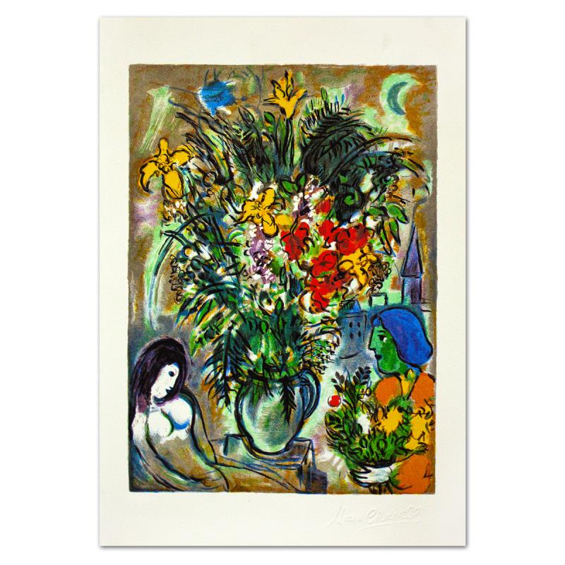 "L'offrande" is a limited edition serigraph on paper by Marc Chagall (1887-1985). Printed by Atelier Tete a Tete in Paris and authorized by the Chagall Estate and ADAGP Paris , the piece is plate signed and comes with a letter of authenticity. Measures approximately 26.5" x 20.5" (image).