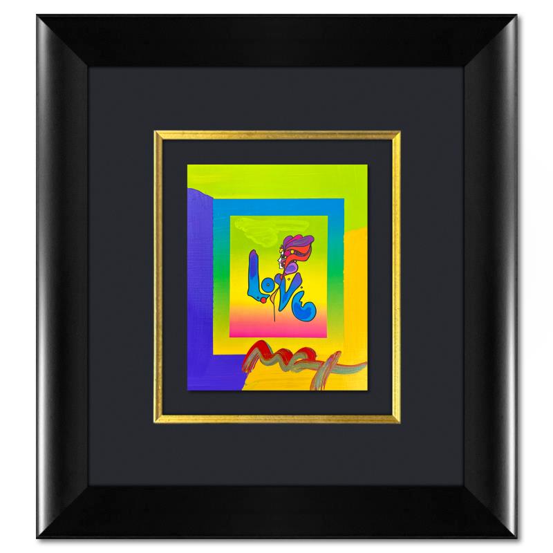 "Love" is a one-of-a-kind acrylic mixed media on paper, hand signed by Peter Max. The piece comes custom framed with a backside cutout to display Peter Max Studio registration number 230797 certifying authenticity. Measures approximately 24" x 22" (frame), 10" x 8" (image). This item requires special handling and may have a longer than usual turnaround.