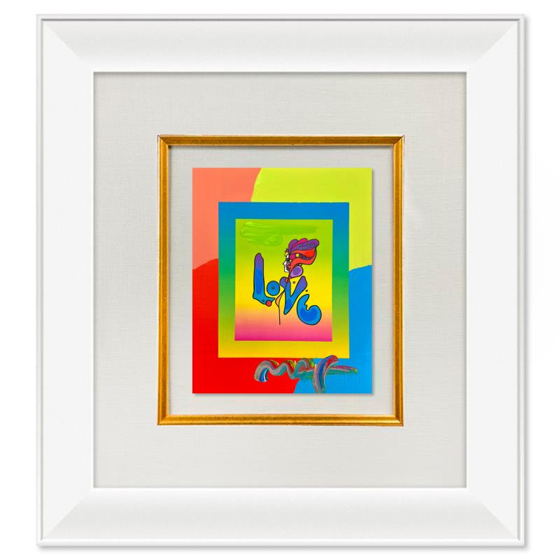"Love" is a one-of-a-kind acrylic mixed media on paper, hand signed by Peter Max. The piece comes custom framed with a backside cutout to display Peter Max Studio registration number 231805 certifying authenticity. Measures approximately 24" x 22" (frame), 10" x 8" (image). This item requires special handling and may have a longer than usual turnaround.