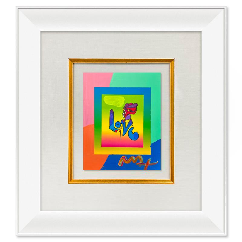 "Love" is a one-of-a-kind acrylic mixed media on paper, hand signed by Peter Max. The piece comes custom framed with a backside cutout to display Peter Max Studio registration number 230833 certifying authenticity. Measures approximately 24" x 22" (frame), 10" x 8" (image). This item requires special handling and may have a longer than usual turnaround.