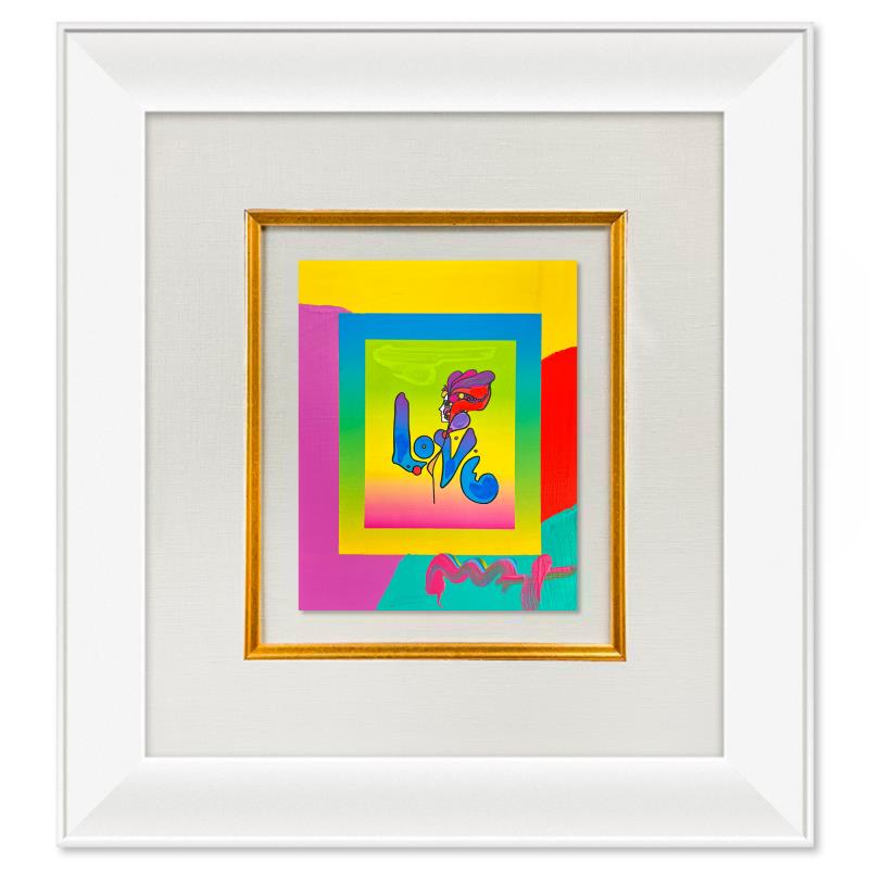 "Love" is a one-of-a-kind acrylic mixed media on paper, hand signed by Peter Max. The piece comes custom framed with a backside cutout to display Peter Max Studio registration number 230814 certifying authenticity. Measures approximately 24" x 22" (frame), 10" x 8" (image). This item requires special handling and may have a longer than usual turnaround.
