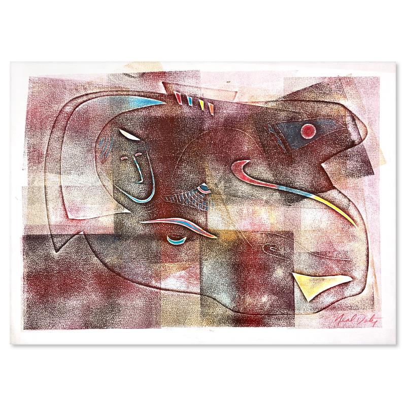 "Maiden Voyage" is a one-of-a-kind mixed media linocut on paper by Neal Doty (1941-2016), hand signed by the artist. Includes Letter of Authenticity. Measures approx. 26" x 20" (border), 22" x 16" (image). There are imperfections in the border area (stain top-left corner and discoloration) that may be concealed when the piece is framed.