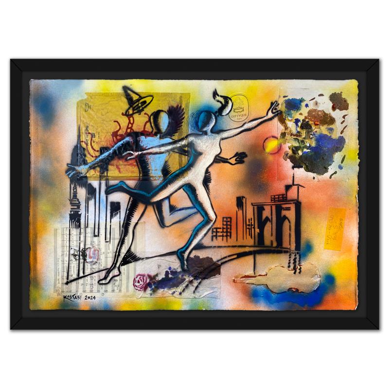 "Majestic Aspiration" is an original mixed media painting on paper by Mark Kostabi, hand signed by the artist. The piece comes framed. Includes Certificate of Authenticity. Measures approx. 35.5" x 48" (frame), 29.5" x 42" (image). This item requires special handling and may have a longer than usual turnaround.