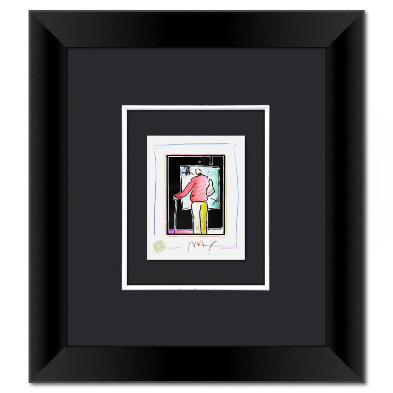 "Man at Easel" is a one-of-a-kind mixed media on paper, hand signed by Peter Max. The piece comes custom framed with a backside cutout to display Peter Max Studio registration number 340010 certifying authenticity. Measures approximately 23" x 21" (frame), 9" x 7" (image). This item requires special handling and may have a longer than usual turnaround.