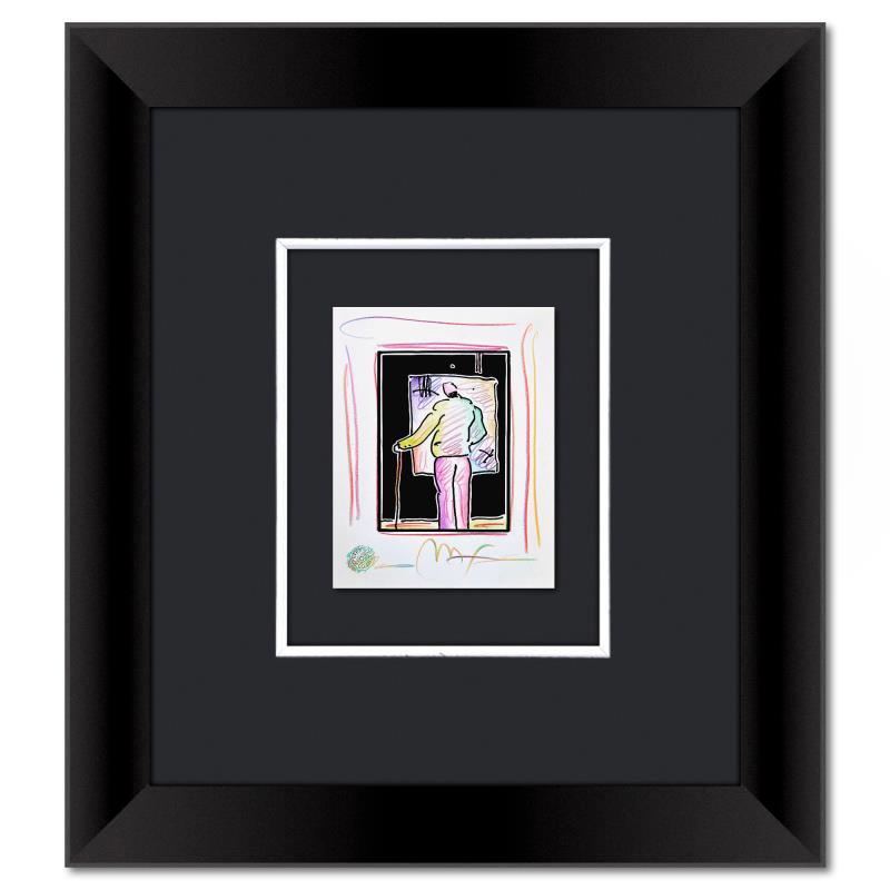 "Man at Easel" is a one-of-a-kind mixed media on paper, hand signed by Peter Max. The piece comes custom framed with a backside cutout to display Peter Max Studio registration number 340008 certifying authenticity. Measures approximately 23" x 21" (frame), 9" x 7" (image). This item requires special handling and may have a longer than usual turnaround.