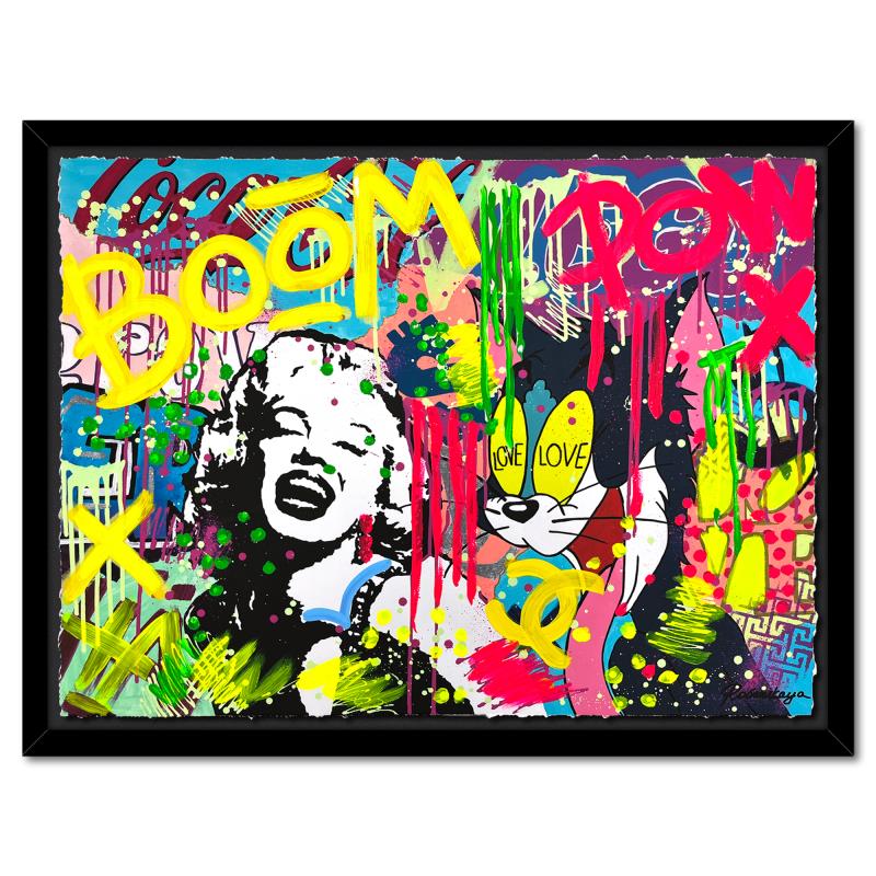 "Marilyn in love" is a one-of-a-kind mixed media on deckle edge paper by Nastya Rovenskaya; hand signed by the artist. This piece comes custom framed and includes letter of authenticity. Measures approximately 36" x 46" (framed), 30" x 40" (image).