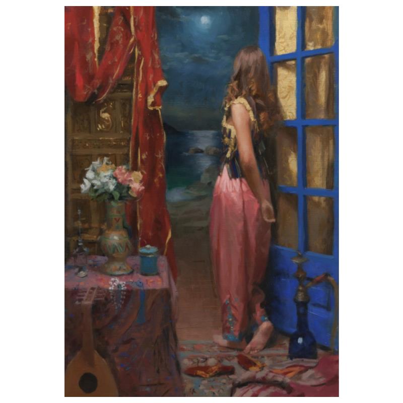"Mediterranean Moonlight" is a limited edition giclee on canvas by Vicente Romero. The piece is hand signed, numbered, and come with a certificate of authenticity. Measures approximately 28" x 20".
