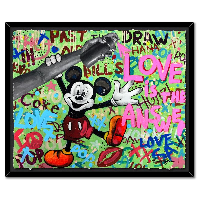 "Mickey Mouse In Love" is a one-of-a-kind mixed media on deckle edge paper by Nastya Rovenskaya; hand signed by the artist. This piece comes custom framed and includes letter of authenticity. Measures approximately 30" x 36" (framed), 24" x 30" (image). This item requires special handling and may have a longer than usual turnaround.