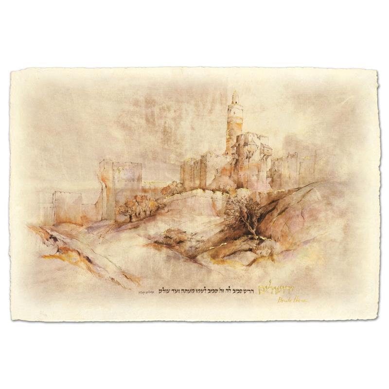 "Migdal David" is a mixed media giclee on handmade Indian paper with goldleaf by Brachi Horen, hand signed by the artist! This creation received personal attention by the artist in the form of water coloring and gilding. Includes Certificate of Authenticity! Measures approx. 23" x 15.5" (with border), 20" x 13" (image).