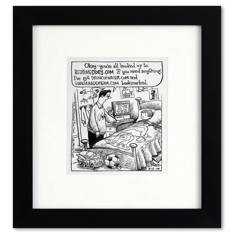 Enter a surreal and satirical world of twisted imagination and award winning creativity. "Modern Bedtime" is an original pen & ink drawing on paper by Dan Piraro, creator of the critically acclaimed and award winning comic strip, Bizarro. This piece is hand signed, comes custom framed and includes a letter of authenticity. Measures approximately 12" x 11" (frame), 7" x 6" (image). This item requires special handling and may have a longer than usual turnaround.