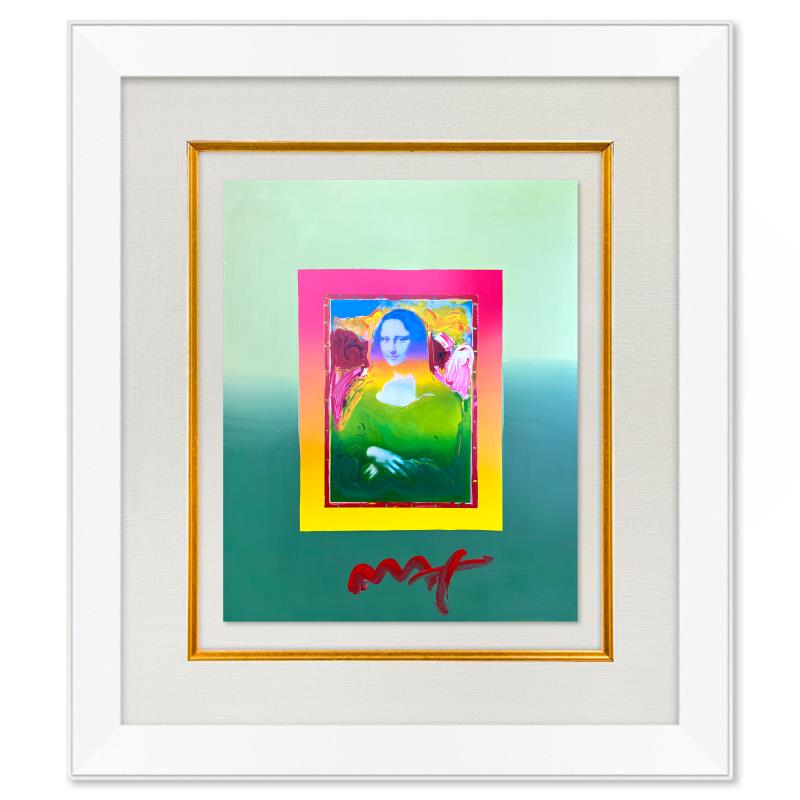 "Mona Lisa" is a one-of-a-kind mixed media on paper, hand signed by Peter Max. The piece comes custom framed with a backside cutout to display Peter Max Studio registration number 322314 certifying authenticity. Measures approximately 28" x 24" (frame), 19" x 15" (image). This item requires special handling and may have a longer than usual turnaround.