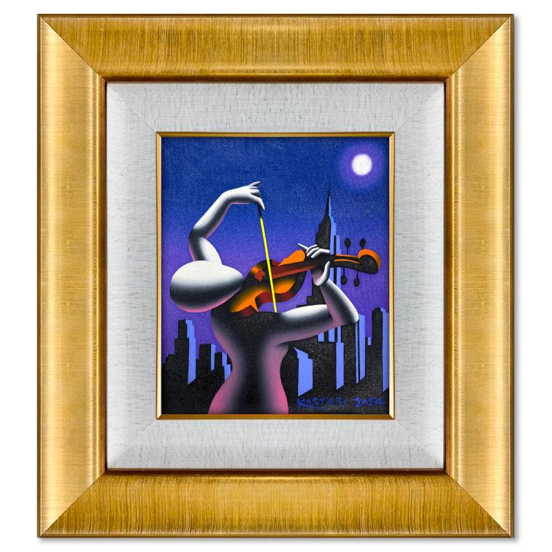 "Moonlit Serenade"is an original oil painting on canvas by Mark Kostabi, hand signed by the artist. This piece comes custom framed. Includes Certificate of Authenticity. Measures approx. 22" x 20" (frame), 12" x 10" (image). This item requires special handling and may have a longer than usual turnaround.