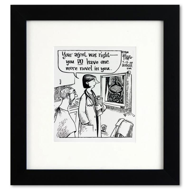 Enter a surreal and satirical world of twisted imagination and award winning creativity. "More Novel" is an original pen & ink drawing on paper by Dan Piraro, creator of the critically acclaimed and award winning comic strip, Bizarro. This piece is hand signed, comes custom framed and includes a letter of authenticity. Measures approximately 12" x 10" (frame), 6.5" x 5" (image). This item requires special handling and may have a longer than usual turnaround.