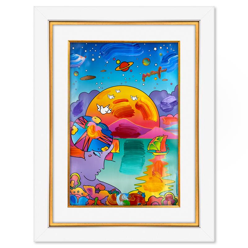 "New Horizon" is a one-of-a-kind mixed media on paper, hand signed by Peter Max. The piece comes custom framed with a backside cutout to display Peter Max Studio registration number 250350 certifying authenticity. Measures approximately 48" x 36" (frame), 36" x 24" (image). This item requires special handling and may have a longer than usual turnaround.