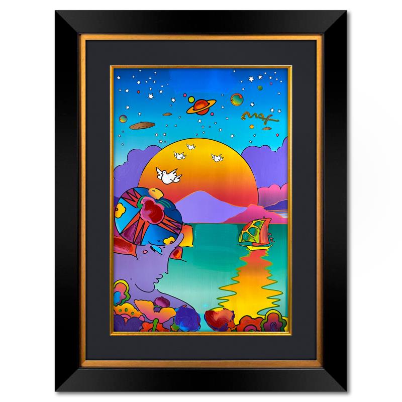 "New Horizon" is a one-of-a-kind mixed media on paper, hand signed by Peter Max. The piece comes custom framed with a backside cutout to display Peter Max Studio registration number 223223 certifying authenticity. Measures approximately 48" x 36" (frame), 36" x 24" (image). This item requires special handling and may have a longer than usual turnaround.